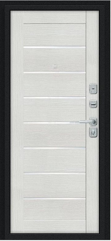 Надежная входная Дверь Браво Техно/BChrome Букле черное/Bianco Melinga премиум класса по цене 37 660 руб. Большая толщина стали защитит от проникновения в ваш дом, квартиру или коттедж. Используется очень качественная фурнитура: замки, цилиндры, ручки, защелки. Покрытие и отделка двери изготовлено под внимательным контролем производителя. Дверь имеет долгий срок службы и гарантию.